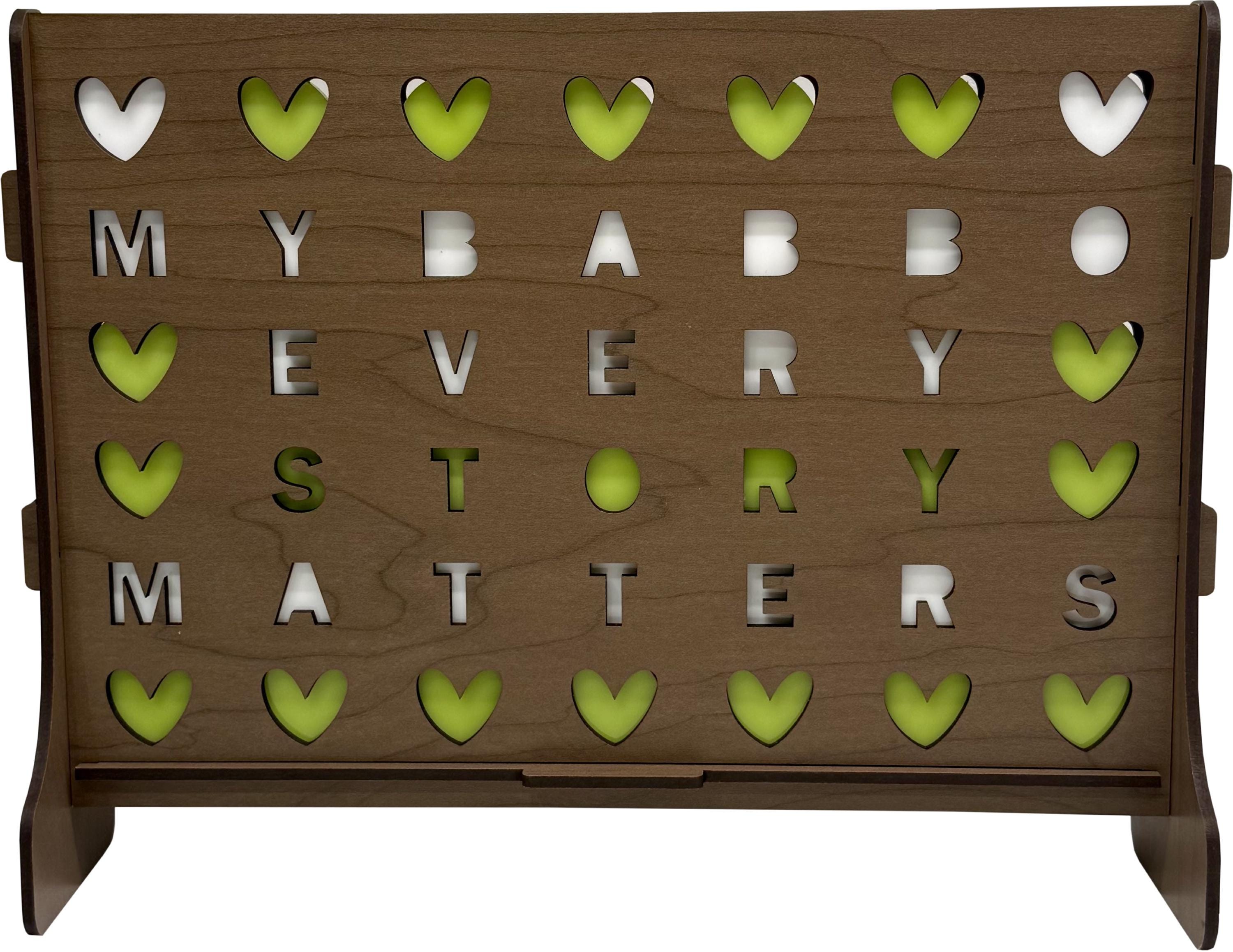 Our four in a row are made from maple, walnut and black/white acrylic, measure 11x7", comes with 42 (21 of each color) playing pieces and it can be personalized with names, dates or a quote. The remaining spaces will have heart shapes. If you want a special design please let us know before buying to get you a quote.